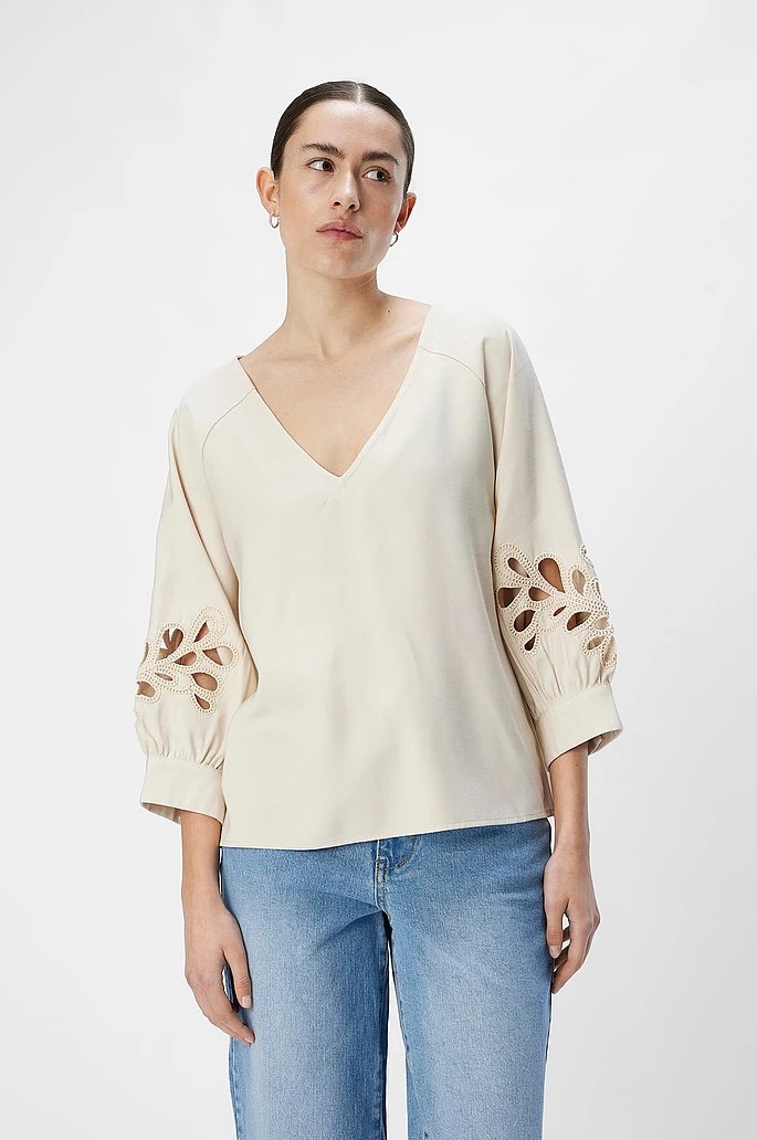 The OBJECT Maiken Sleeve Detail Blouse is a loose-fitting, sandshell-colored top designed with a V-neckline and three-quarter raglan sleeves. The standout feature is the laser-cut floral embroidery on the sleeves near the cuffs, which are gently gathered for a subtle puff effect. Casual yet refined, this blouse is easy to style with jeans or tailored bottoms.